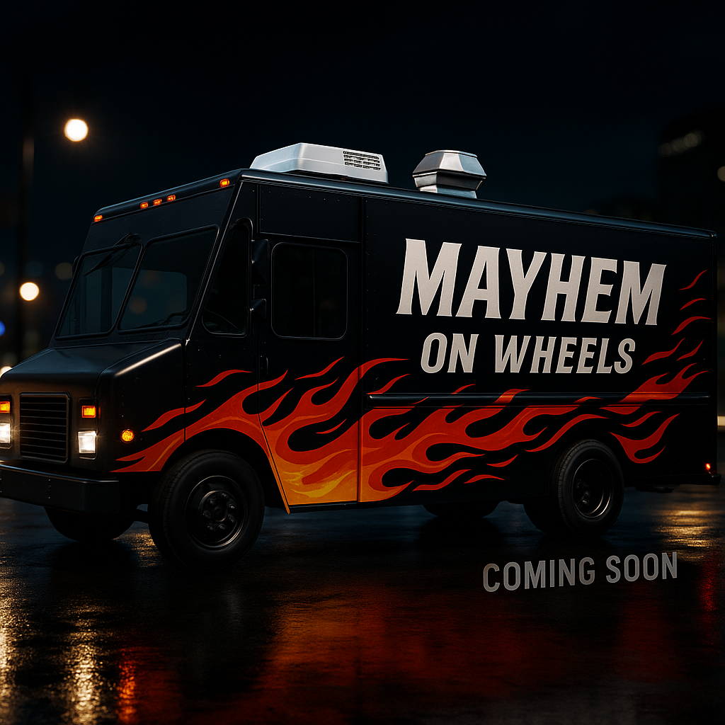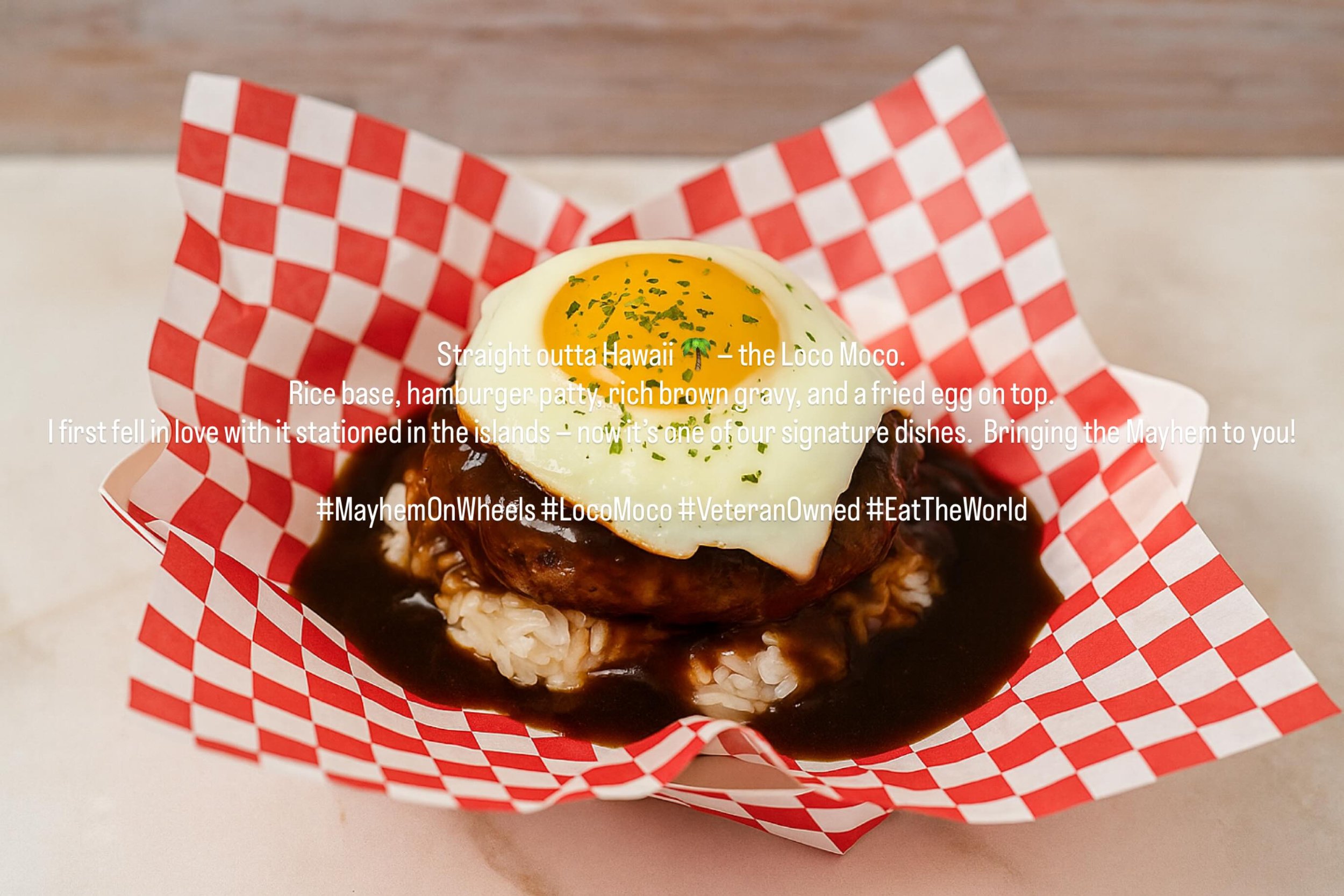 A Mayhem take on Hawaii’s plate lunch classic — the Loco Moco. Traditionally served over rice, ours is loaded onto golden fries instead, then topped with a savory hamburger patty, rich brown gravy, and a fried egg. Comfort food reimagined, Mayhem style.